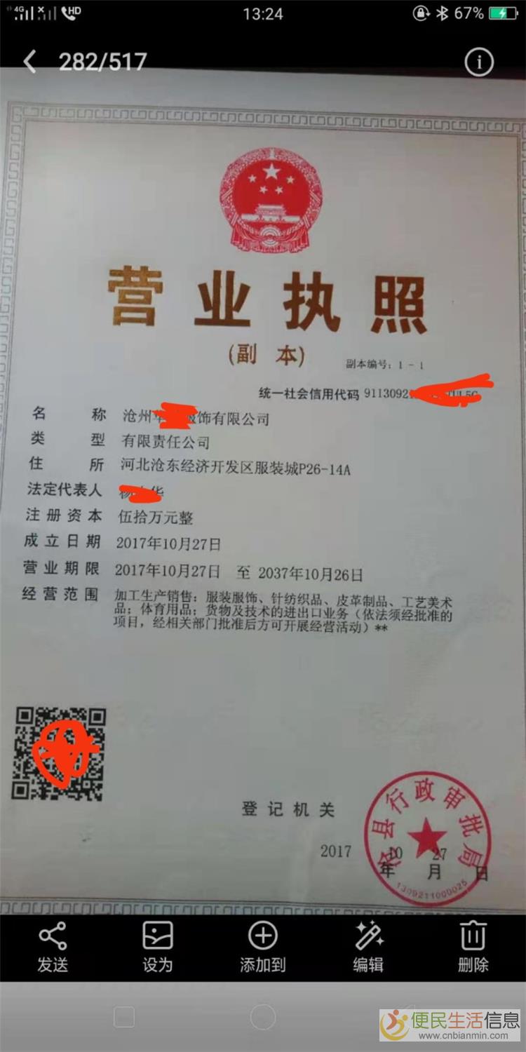 本服装公司在2017年在沧县经济开发区(服装产业园)购买了3225平方工业用地,并办理好营业执照(白户无任何经营),土地证原件在手,契税已缴纳完毕,手续齐全、无任何债务纠纷。现因公司产业链转移,无精力再进行开发,所以想(整体打包转让)连企业营业执照及所有股权和土地一起转让,诚心寻找有缘人接手、现价格从优,有意者请联系企业负责人:13678993569周先生便~民~生~活~信~息